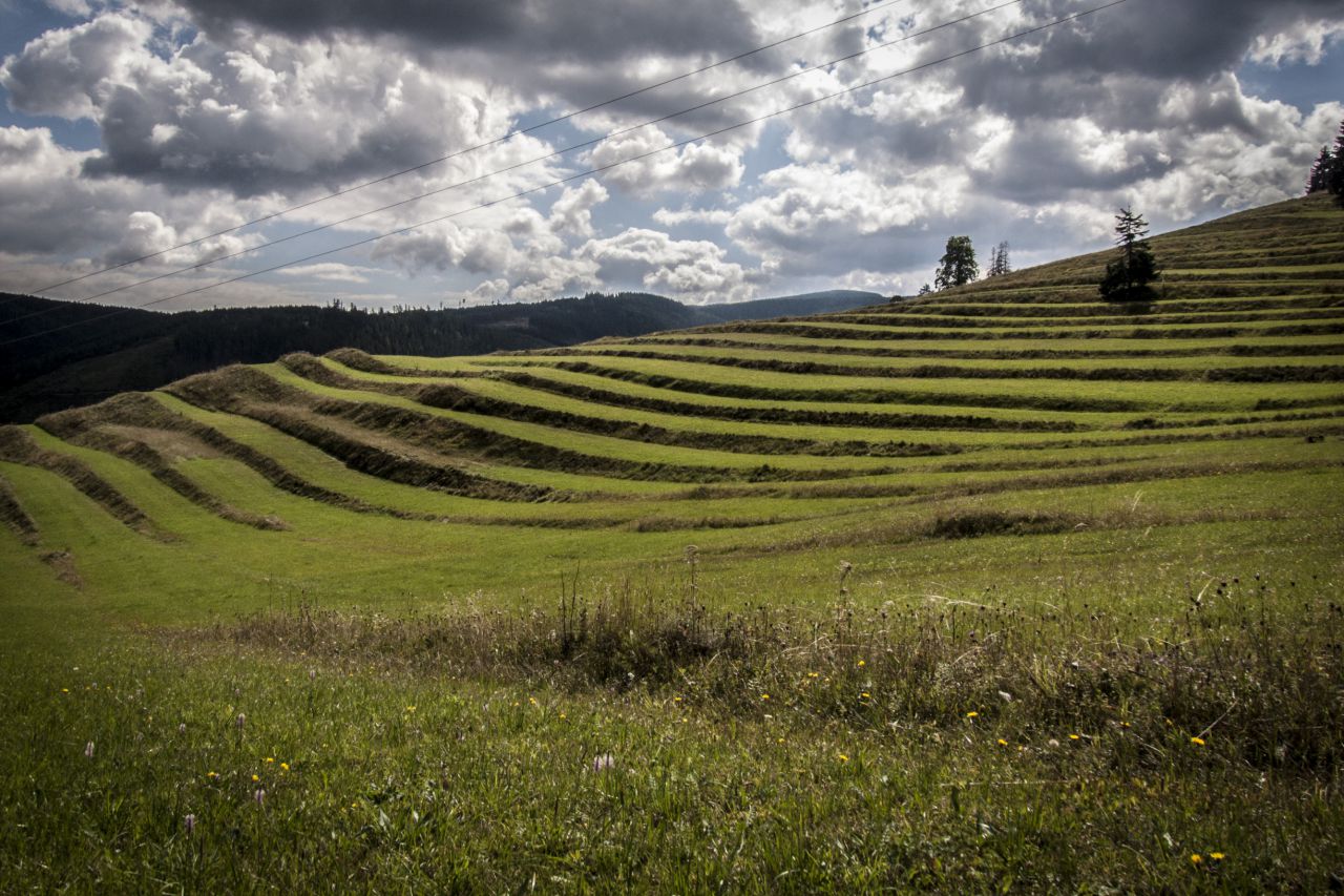 Terasovité polia vznikli oraním do svahu a navršovaním skál, ktoré sa vyberali ako nežiaduce z pôdy. Jeden úzky pás mal viacerých majiteľov. Využívali sa na pestovanie zemiakov, obilnín a vyhotovenie sena. Neskorým príchodom združstevňovania a vôľou obyvateľov nedošlo k rozoraniu medzí. Dodnes tak môžeme obdivovať pásy políčok siahajúcich k oblohe ,,schody do neba“. V súčasnosti ich obhospodarovaním udržiavajú niektorí občania a Poľnohospodárske podielnícke družstvo. Za uchovanie terasovitých polí - unikátnych historických krajinných štruktúr získala obec ocenenia Ceny SR za krajinu 2014 a špeciálne ocenenie Rady Európy 2015.