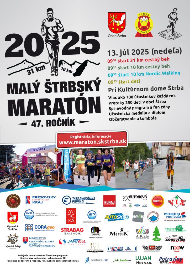 V nedeľu 13. júla 2025 sa v Štrbe uskutoční 47. ročník Malého štrbského maratónu. Týždeň pred pretekmi je prihlásených 700 športovcov z Česka, Rakúska, Poľska, Maďarska, Írska, Ukrajiny a Slovenska. Organizátori sa pripravujú aj na prekonanie účastníckeho rekordu 821 bežcov z roku 2019. Na štarte 31 km trate sa predstaví až 9 bežcov, ktorí v historických tabuľkách zabehli náročných 31 kilometrov pod dve hodiny a 4 víťazi z predchádzajúcich ročníkov. Štart zvažuje aj Tibor Sahajda, minuloročný víťaz, ktorý v Štrbe štartoval sedemkrát a v roku 2019 zabehol najlepší slovenský výsledok 1:40:15 hod. V tom istom roku Keňan Simon Kamau Njeri stanovil traťový rekord 01:39:33 hod. Ženskou favoritkou je víťazka z minulého ročníka Petra Pastorová, ktorá zvíťazila s časom 2:09:50. Ženský traťový rekord 1:54:21 hod. drží Alena Peterková od roku 2000.