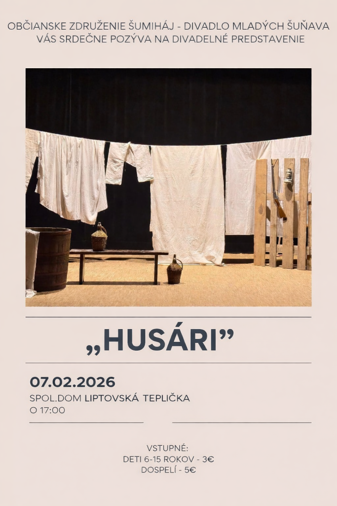 Pozývame vás na večer plný humoru, kvalitných a výrazných hereckých výkonov v podaní divadelných ochotníkov zo Šuňavy. V sobotu 7. februára o 17.00 odohrajú predstavenie Husári v sále spoločenského domu. Nenechajte si ujsť túto príležitosť a vyplňte si jeden z fašiangových večerov aj divadelným umením. Tešíme sa na vás. Veríme, že radi prispejete svojou účasťou a vstupným na podporu umenia, ktoré vytvárajú ochotníci vo svojom voľnom čase pre druhých. Vstupné dospelí: 5€, deti 6 – 15 rokov: 3 €.
