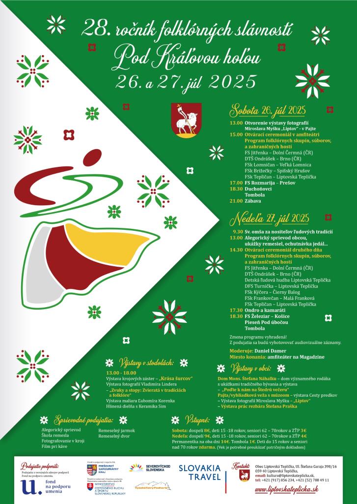 Pozývame vás do malebnej obce Liptovská Teplička na 28. ročník folklórnych slávností Pod Kráľovou hoľou, ktoré sa uskutočnia 26. a 27. júla 2025 v jedinečnom prostredí zemiakových pivníc a historických stodol.