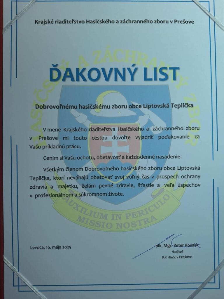 pamätné medaily pri príležitosti sviatku sv. Floriána. Medzi oceneným bol aj Dobrovoľný hasičský zbor obce Liptovská Teplička. Ocenenie za príkladnú prácu prevzal z rúk krajského riaditeľa starosta obce Mgr. Slavomír Kopáč a veliteľ DHZO Peter Géci.